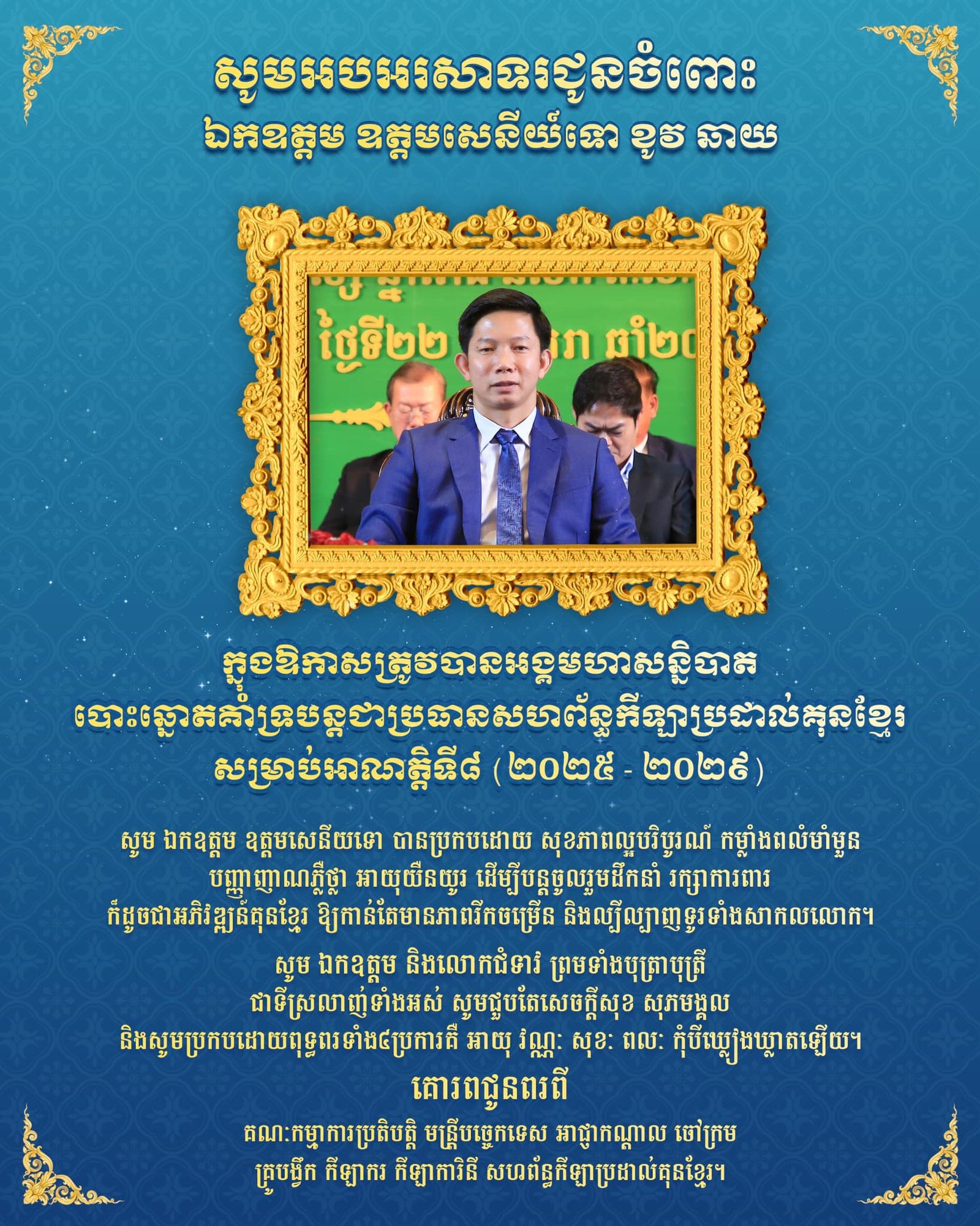 Με ιδιαίτερη τιμή και ενθουσιασμό, η Ομοσπονδία Kun Khmer ανακοίνωσε την επανεκλογή του Εξοχότατου Υποστράτηγου Kov Chhai ως Πρόεδρου της Ομοσπονδίας για την 8η θητεία, που καλύπτει την περίοδο 2025-2029.