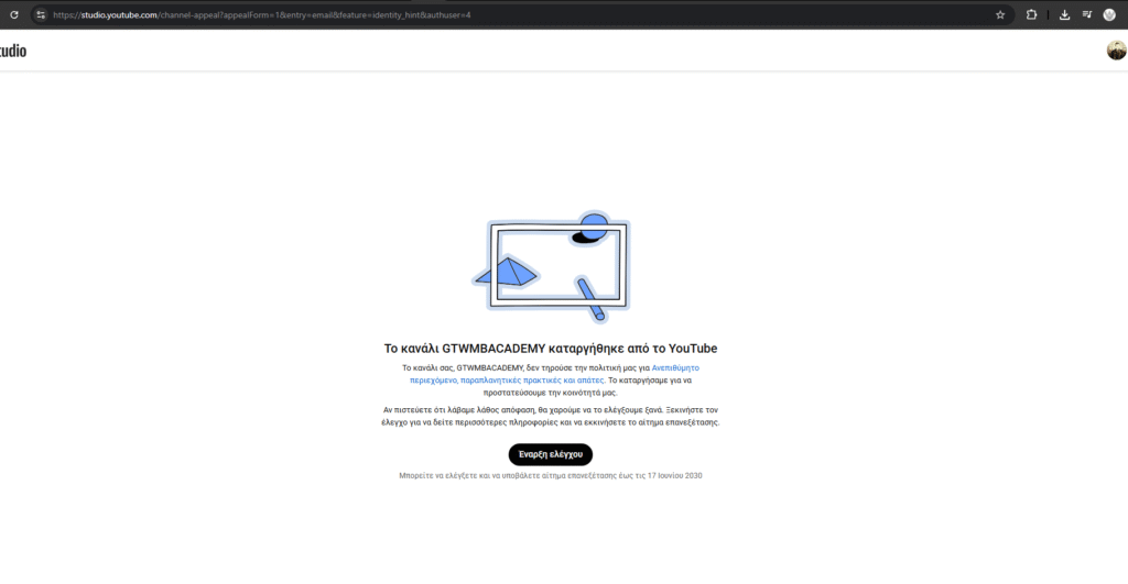 Καταγγέλλω δημοσίως τη μονομερή, αυθαίρετη και ανεξήγητη διαγραφή του καναλιού μου GTWMBACADEMY στο YouTube, μετά από χρόνια δημιουργικής, εκπαιδευτικής και πολιτιστικής δραστηριότητας, χωρίς σαφή αιτιολογία, χωρίς δίκαιη διαδικασία, και με ενδεχόμενο πολιτικό ή αλγοριθμικό κίνητρο φίμωσης.